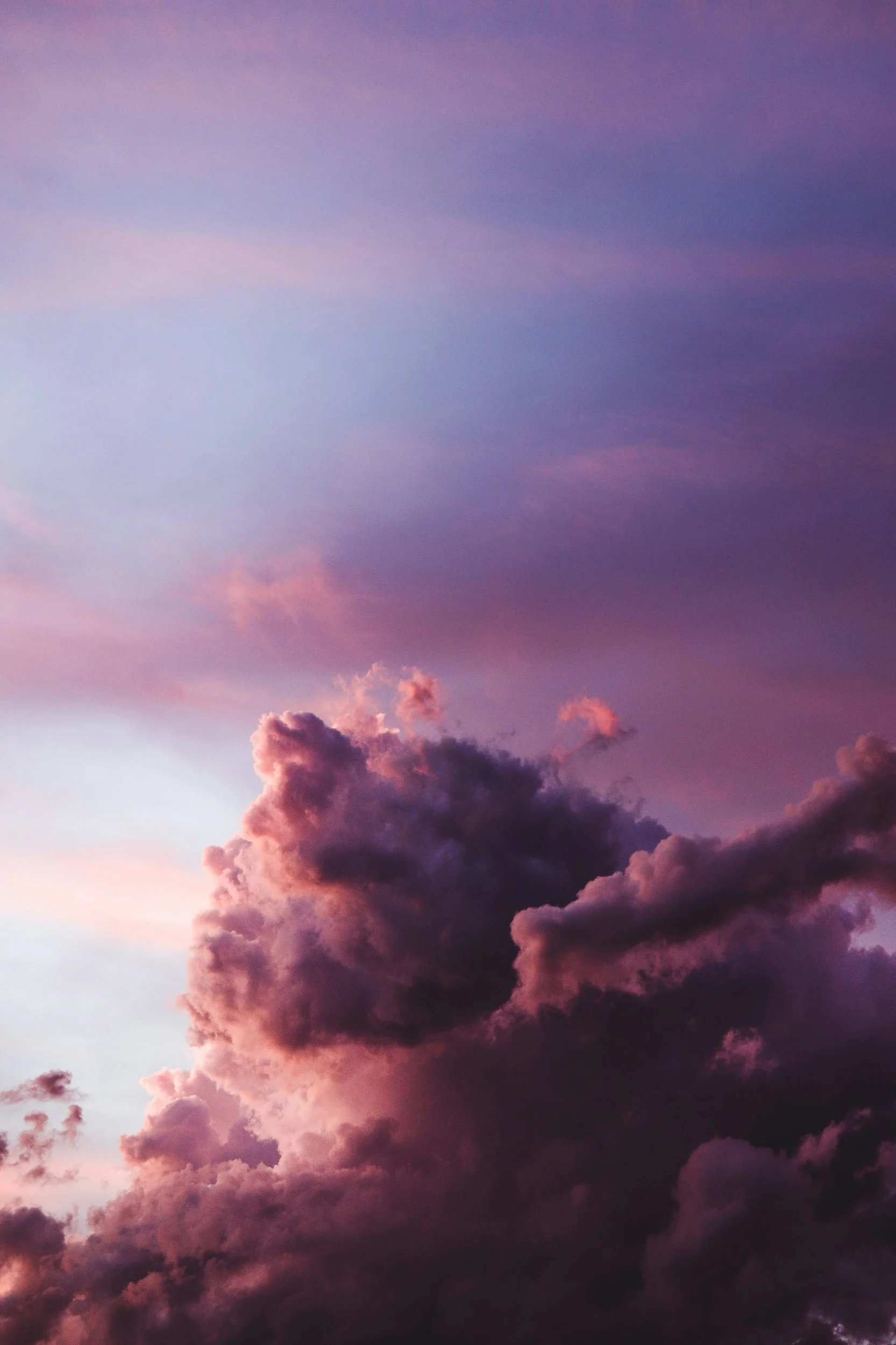 Image description: a breathtakingly-detailed photo of a purple and pink cloud formation against a dusty blue sky.